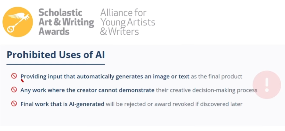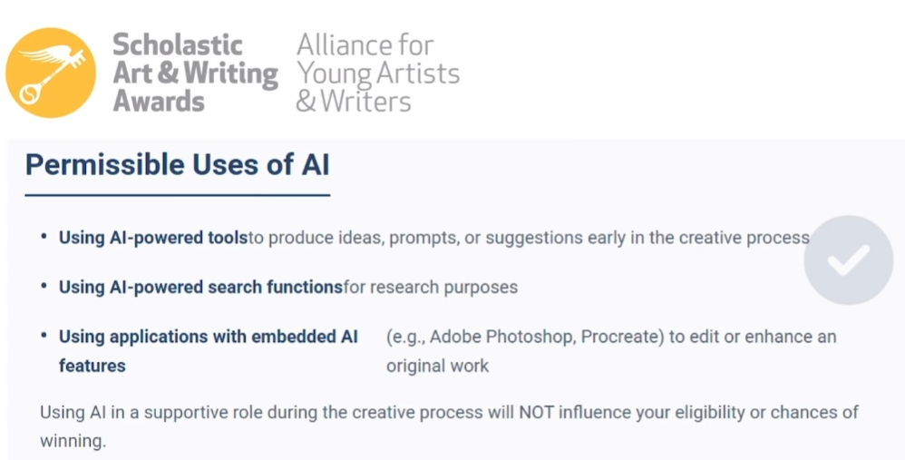 For example, Scholastic Art & Writing does allow limited use of AI-based tools in certain stages. Students may use AI to brainstorm ideas, support research, or assist with programs like Photoshop.